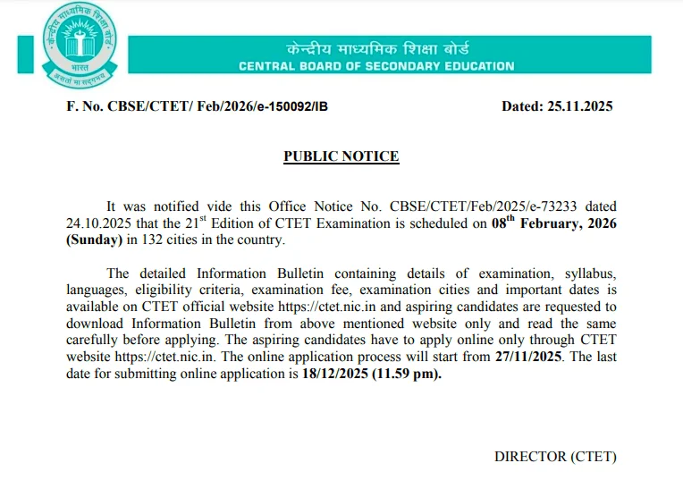 इस लेख के माध्यम से हम उन सभी उम्मीदवार जो CTET 2026 की तैयारी कर रहे हैं। CBSE ने आधिकारिक नोटिस जारी करते हुए यह साफ कर दिया है कि CTET परीक्षा 08 फरवरी 2026 को आयोजित की जाएगी।