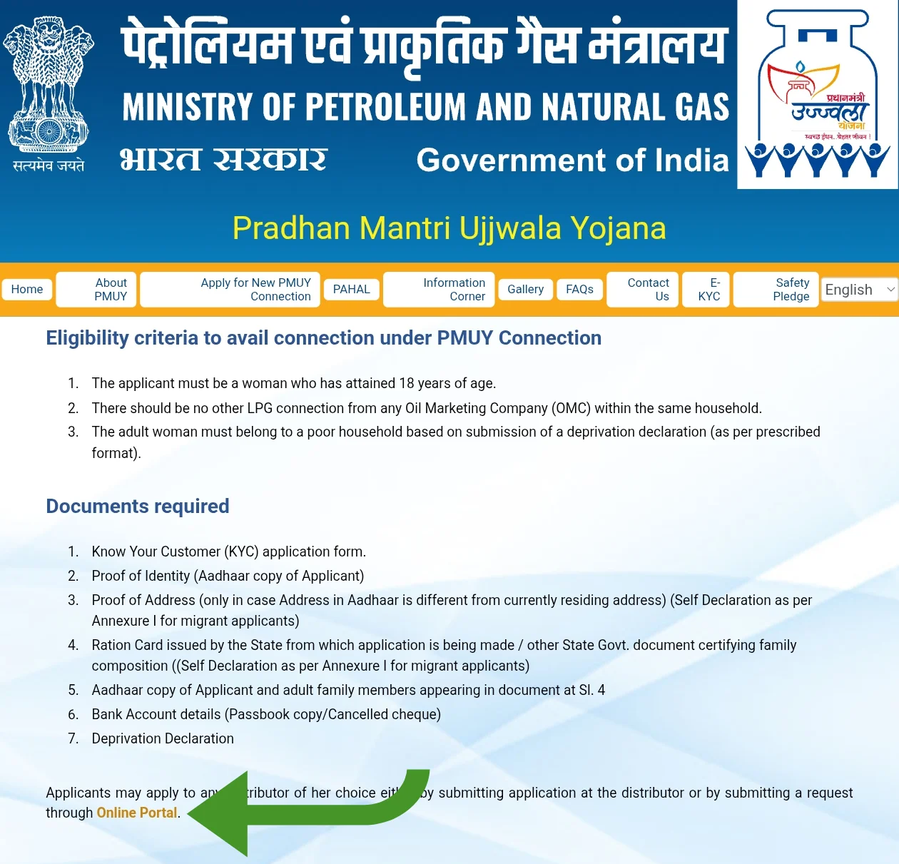 3. वहां पर उपलब्ध सम्पूर्ण जानकारी पढ़ें। और उसके बाद सबसे नीचे Online Portal पर क्लिक करें जो इस तरह दिखेगा PM Ujjwala Yojana 2026